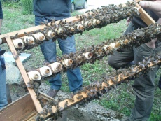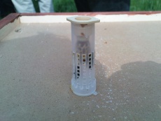 Nach 16 Tagen werden auf den Weiselbechern Kunststoffkäfige gestülpt. Diese soll die Königinen vor ihren Geschwistern schützen, damit sie sich nicht gegenseitig totstechen können.
